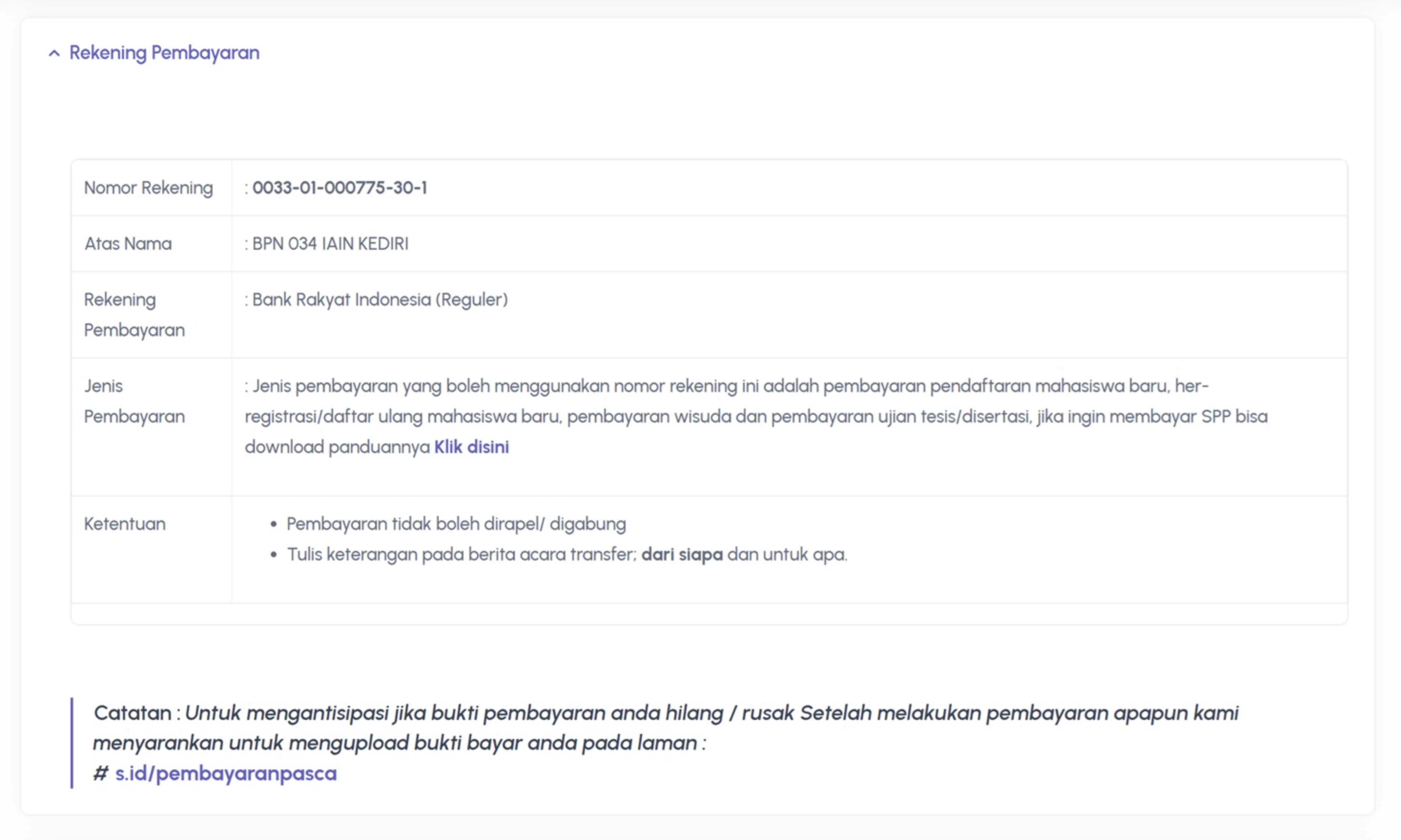 | Jenis Pembayaran | : Jenis pembayaran yang boleh menggunakan nomor rekening ini adalah pembayaran pendaftaran mahasiswa baru, her-registrasi/daftar ulang mahasiswa baru, pembayaran wisuda dan pembayaran ujian tesis atau disertasi, jika ingin membayar SPP bisa download panduannya Klik disini |